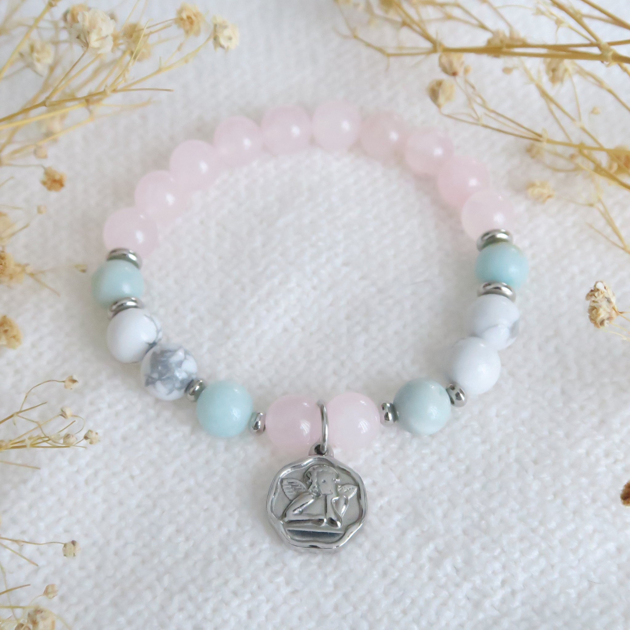Le bracelet Ange Gardien est fabriqué avec des pierres de Quartz rose, d'Amazonite et d'Howlite de 8mm. Son pendentif d'Ange est en acier inoxydable. Portez ce bijou de la collection Guidance comme un rappel doux de la présence et de la protection de votre ange gardien.