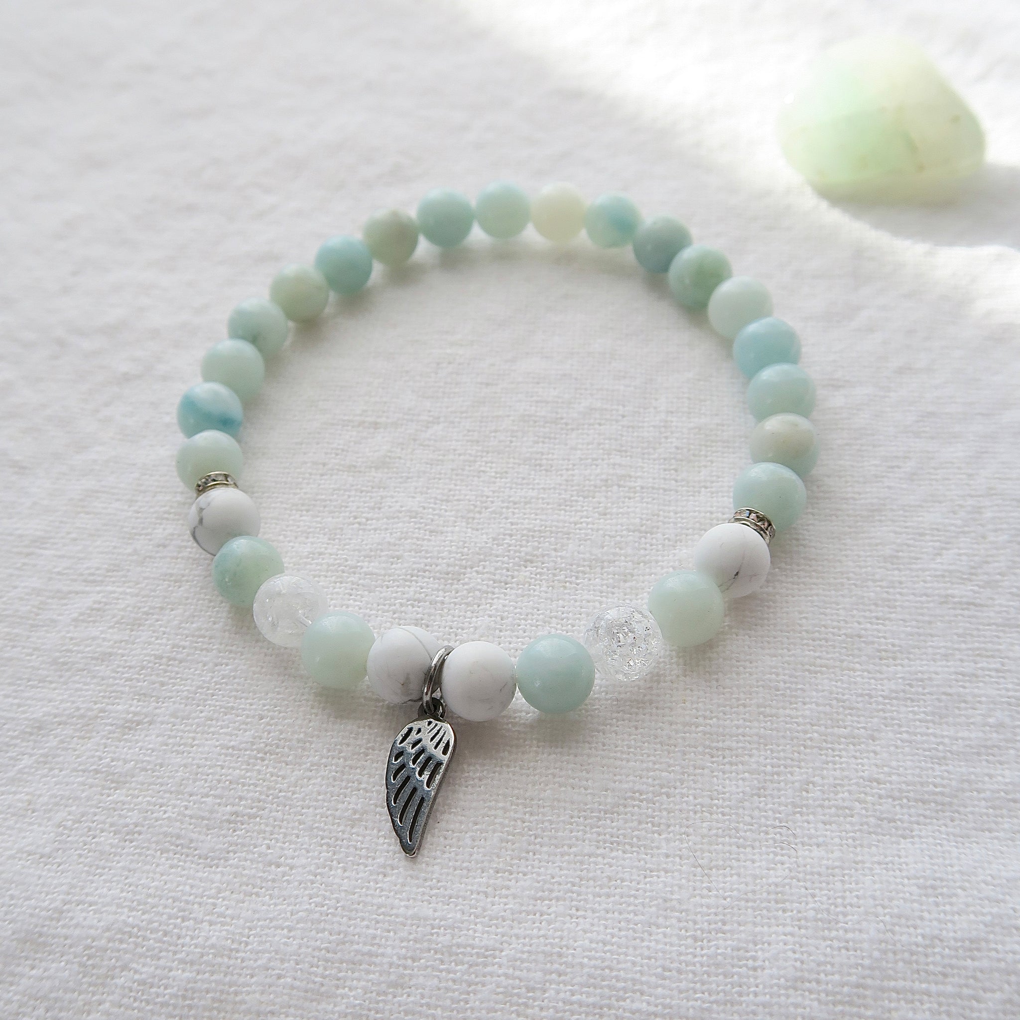 Le bracelet Soutien Céleste est fait de pierres d'Amazonite, d'Howlite et de Quartz craquelé de 6mm. Il est agrémenté d'un pendentif d'aile d'ange en acier inoxydable. Portez ce bijou de la collection Guidance comme un rappel doux de la présence et de la protection de votre ange gardien.