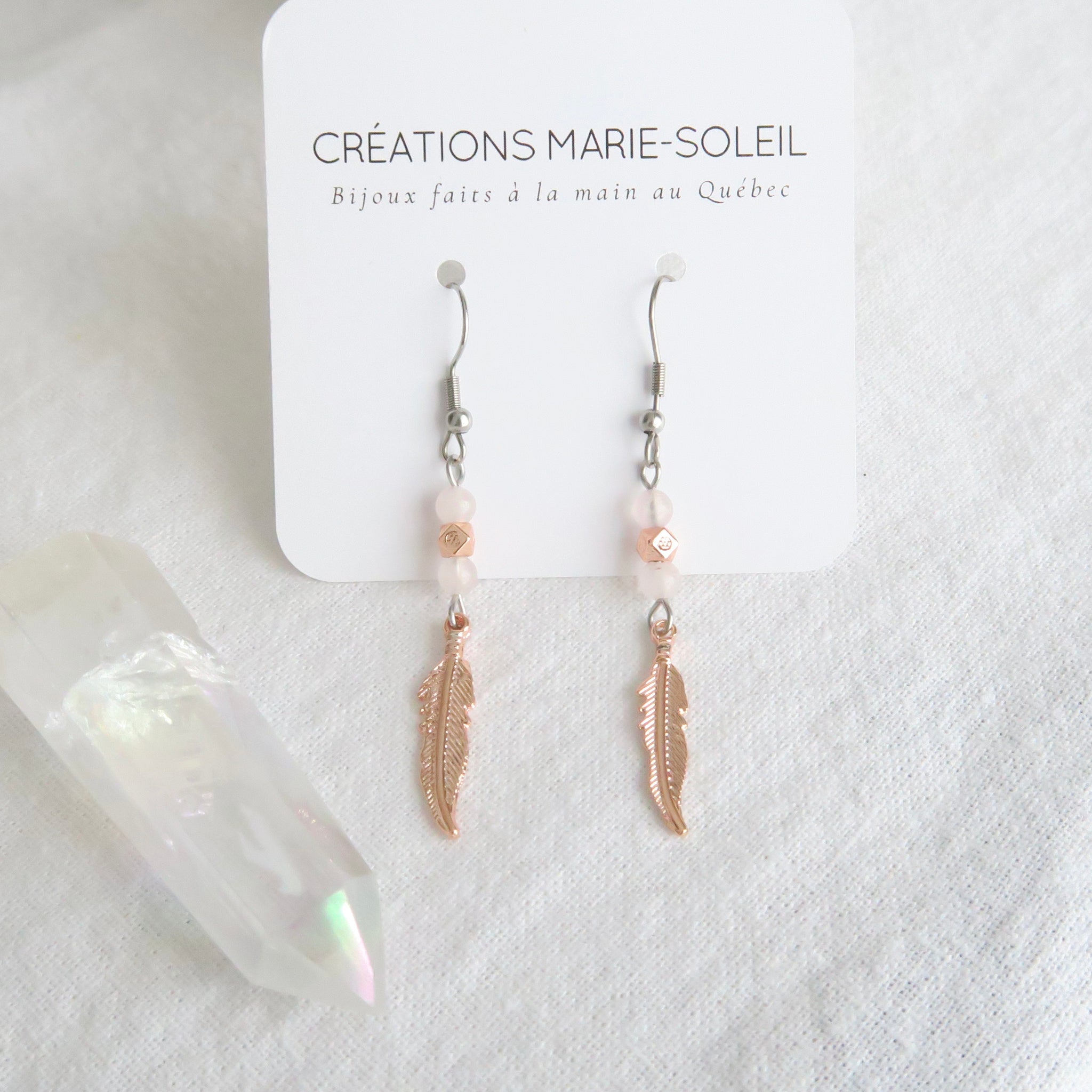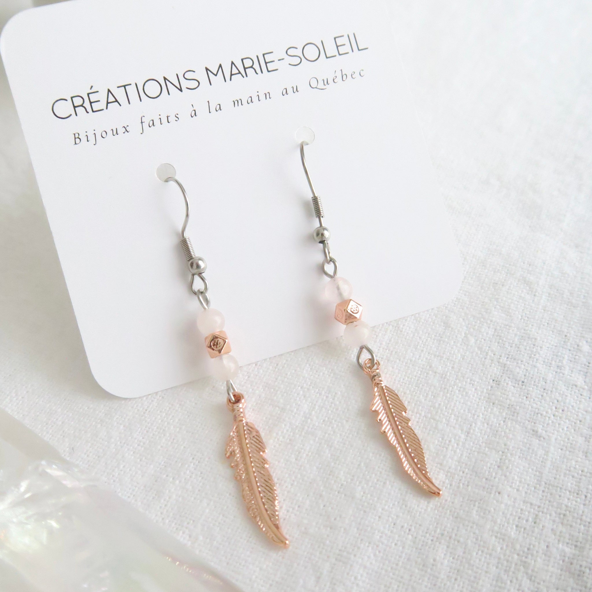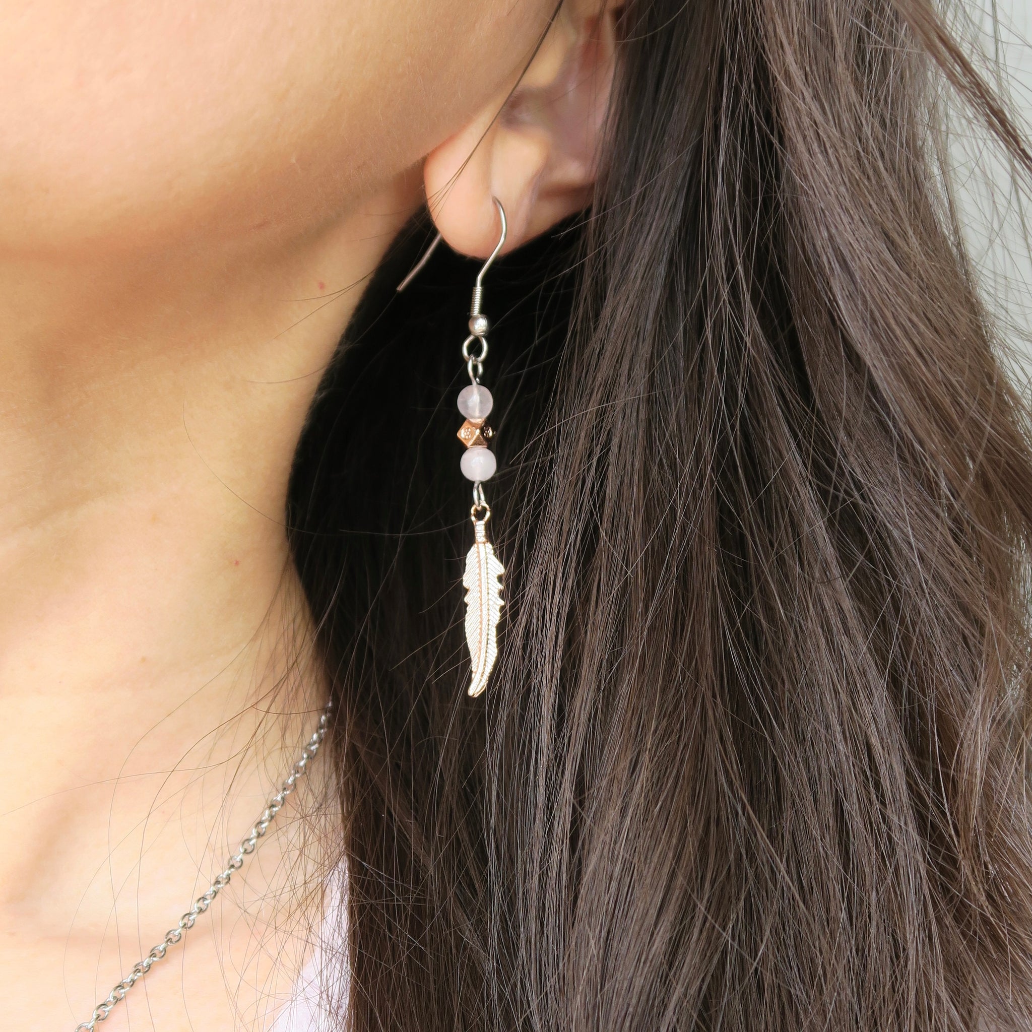 Boucles d’oreilles en acier inoxydable avec pierres de Quartz rose de 4mm et pendentif de plume plaqué rose gold.