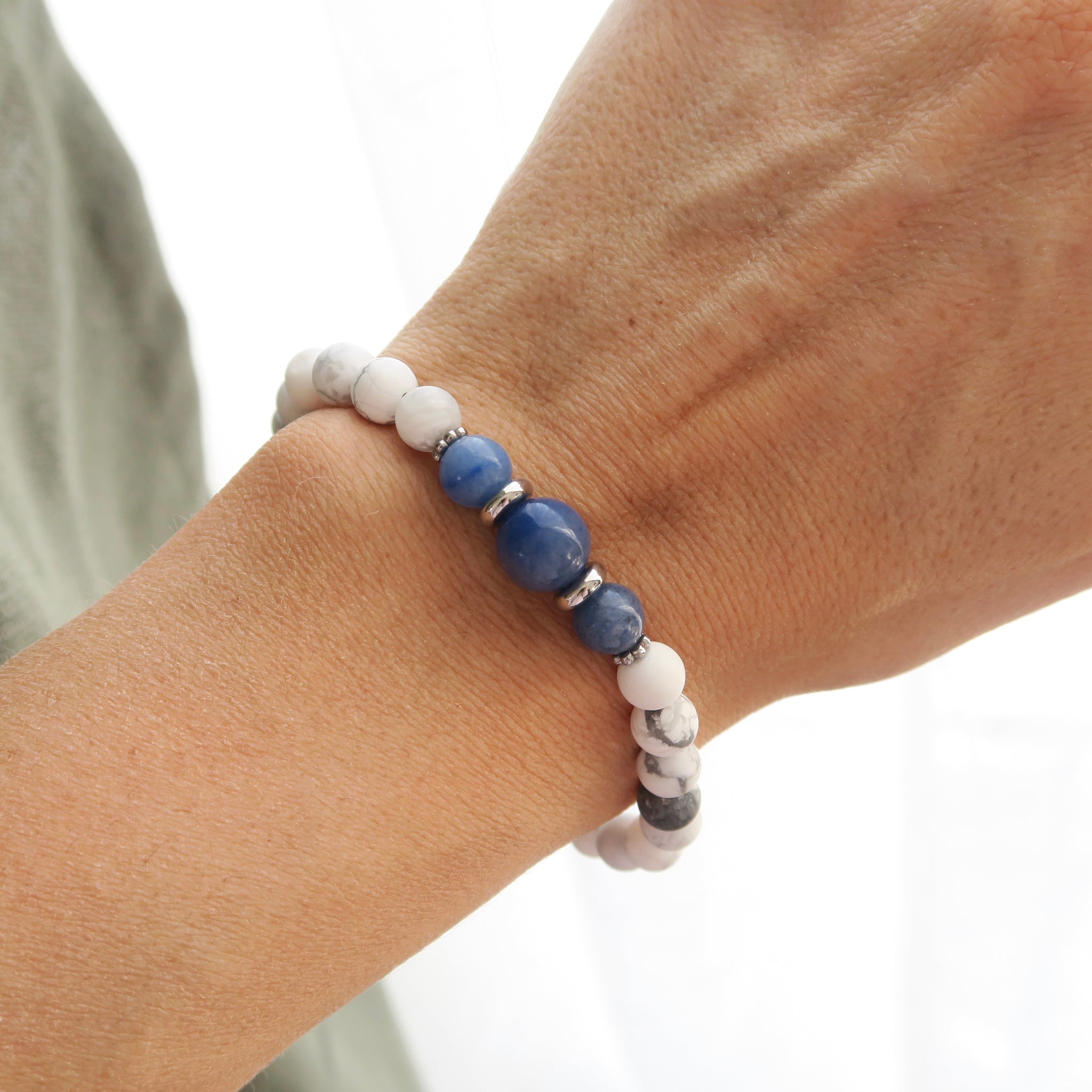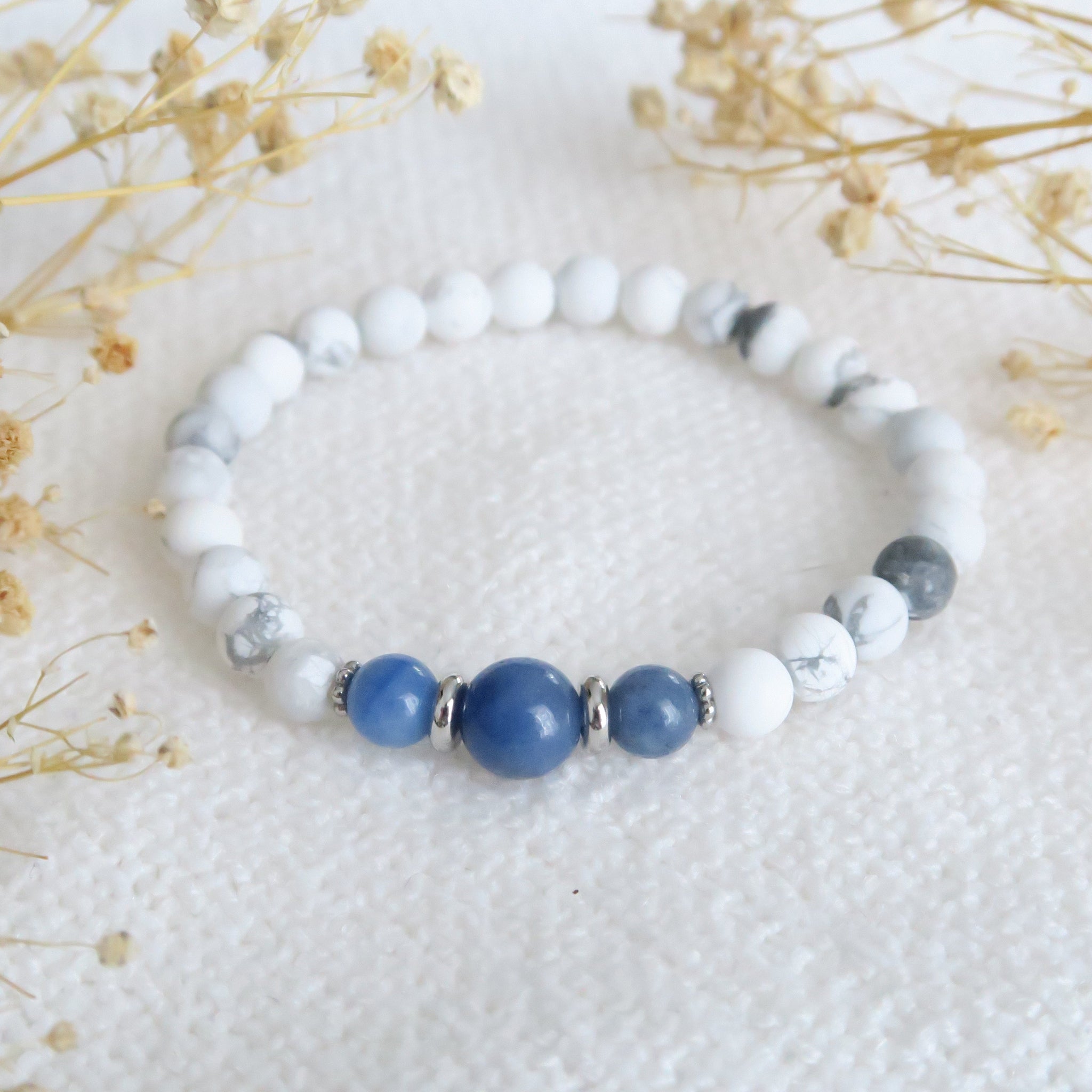 Le bracelet Alignement est conçu avec des pierres d’Howlite de 6mm ainsi que des pierres d’Aventurine bleue de 6 et 8mm. Portez ce bijou de la collection Guidance comme un rappel doux de la présence et de la protection de votre ange gardien.