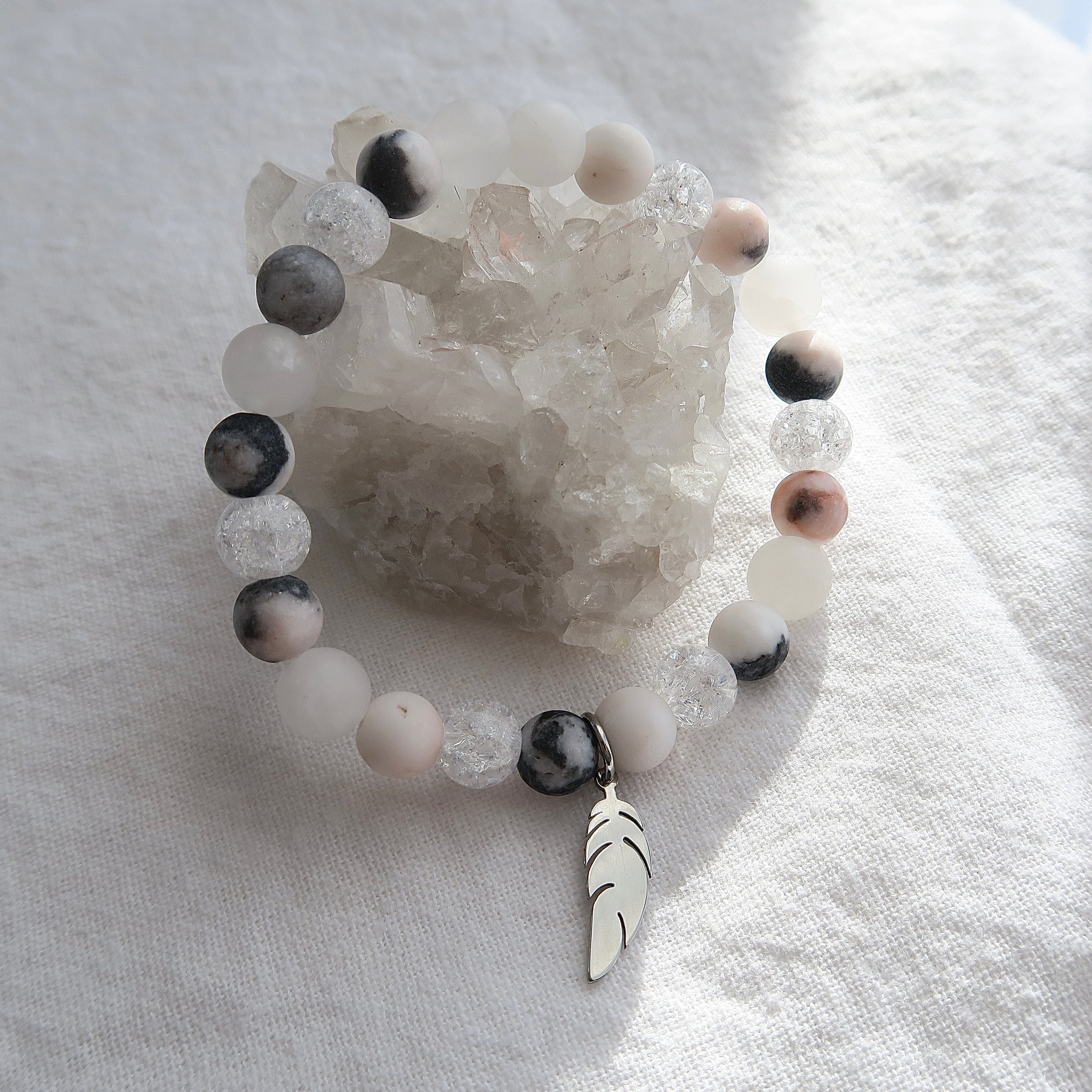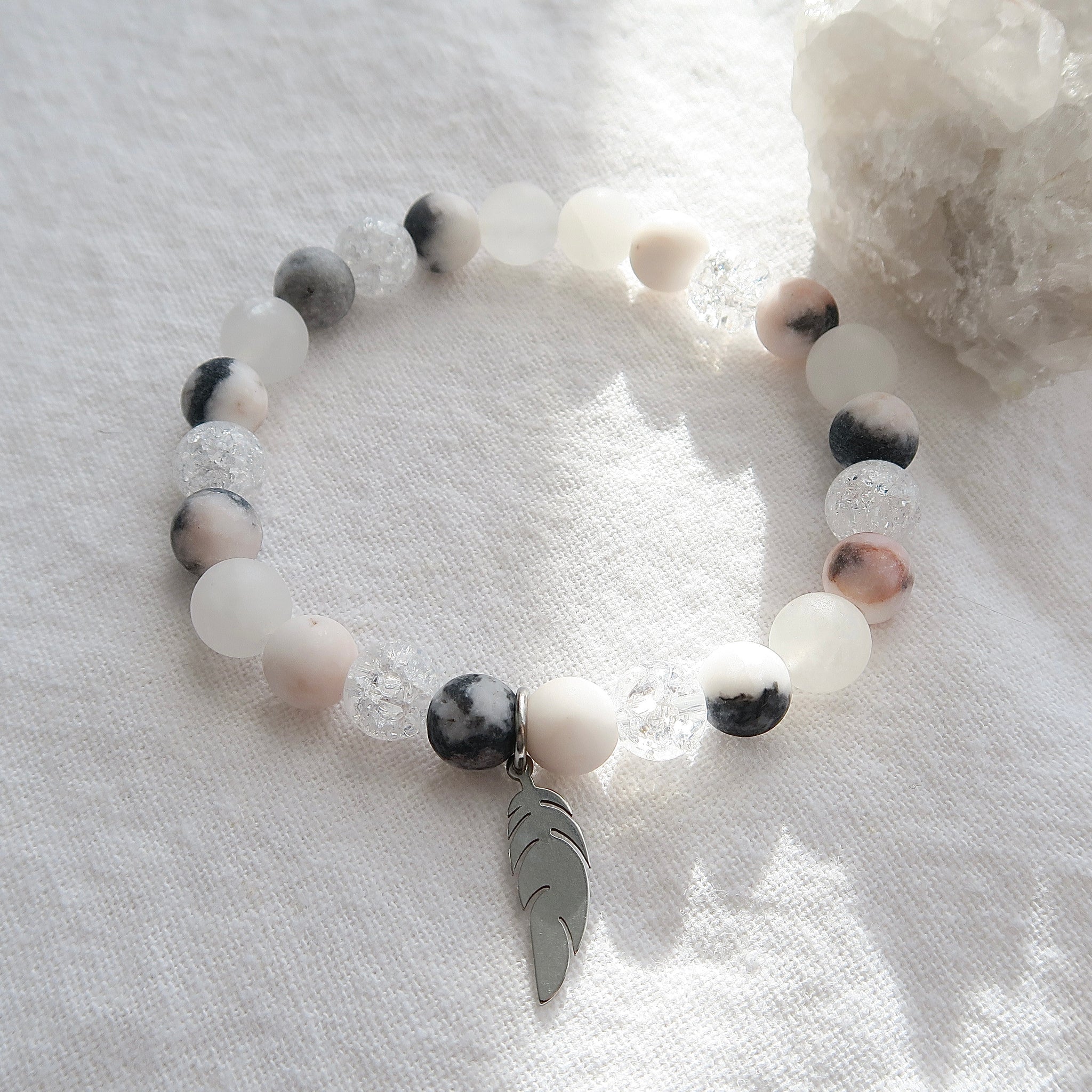 Le bracelet Chemin Aligné est fait de pierres de Jaspe zèbre, de Quartz craquelé ainsi que de Jade blanc de 8mm. Portez ce bijou de la collection Guidance comme un rappel doux de la présence et de la protection de votre ange gardien.