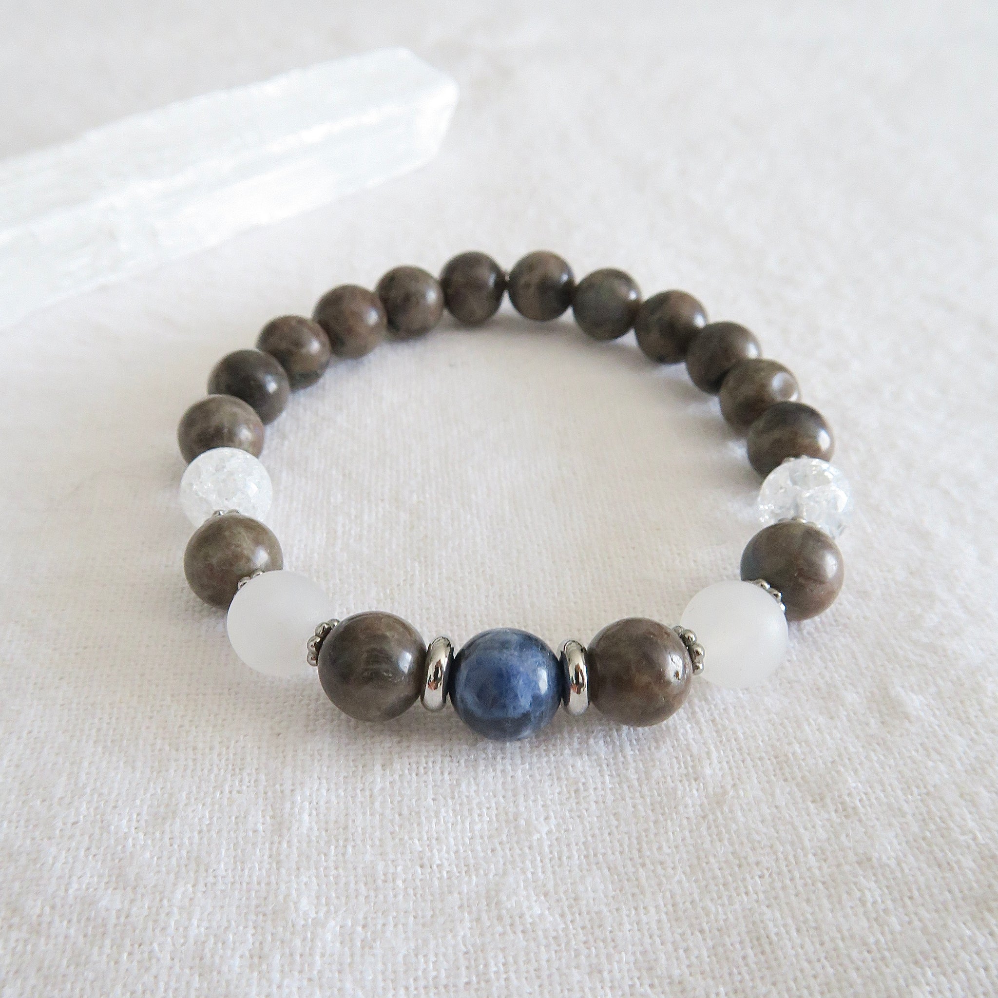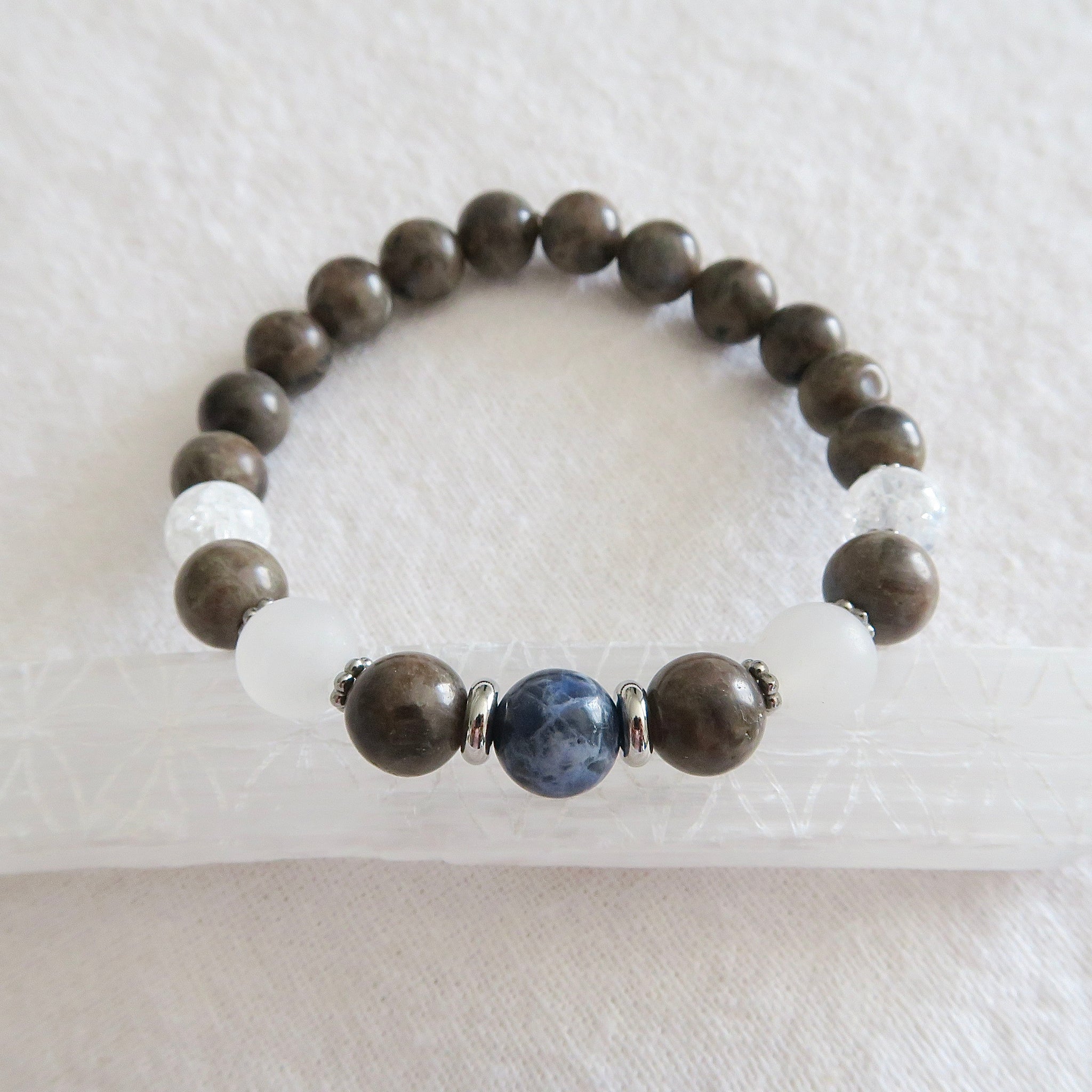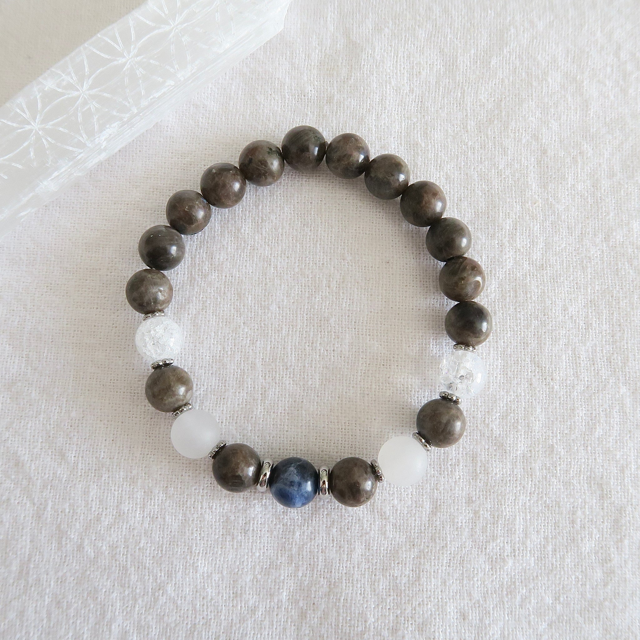 Le bracelet Clarté intuitive est fait de pierres de Labradorite, de Sodalite, de Quartz et de Jade blanc de 8mm.