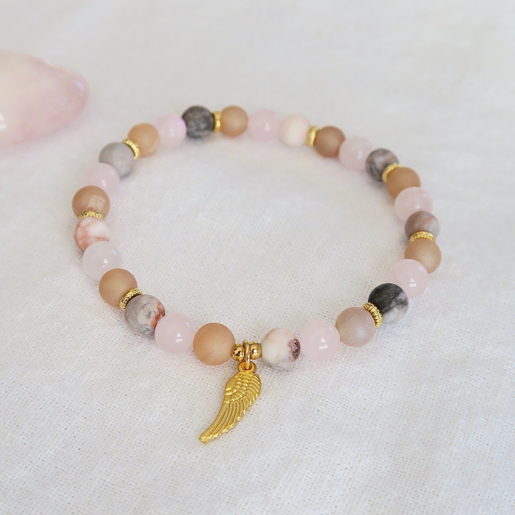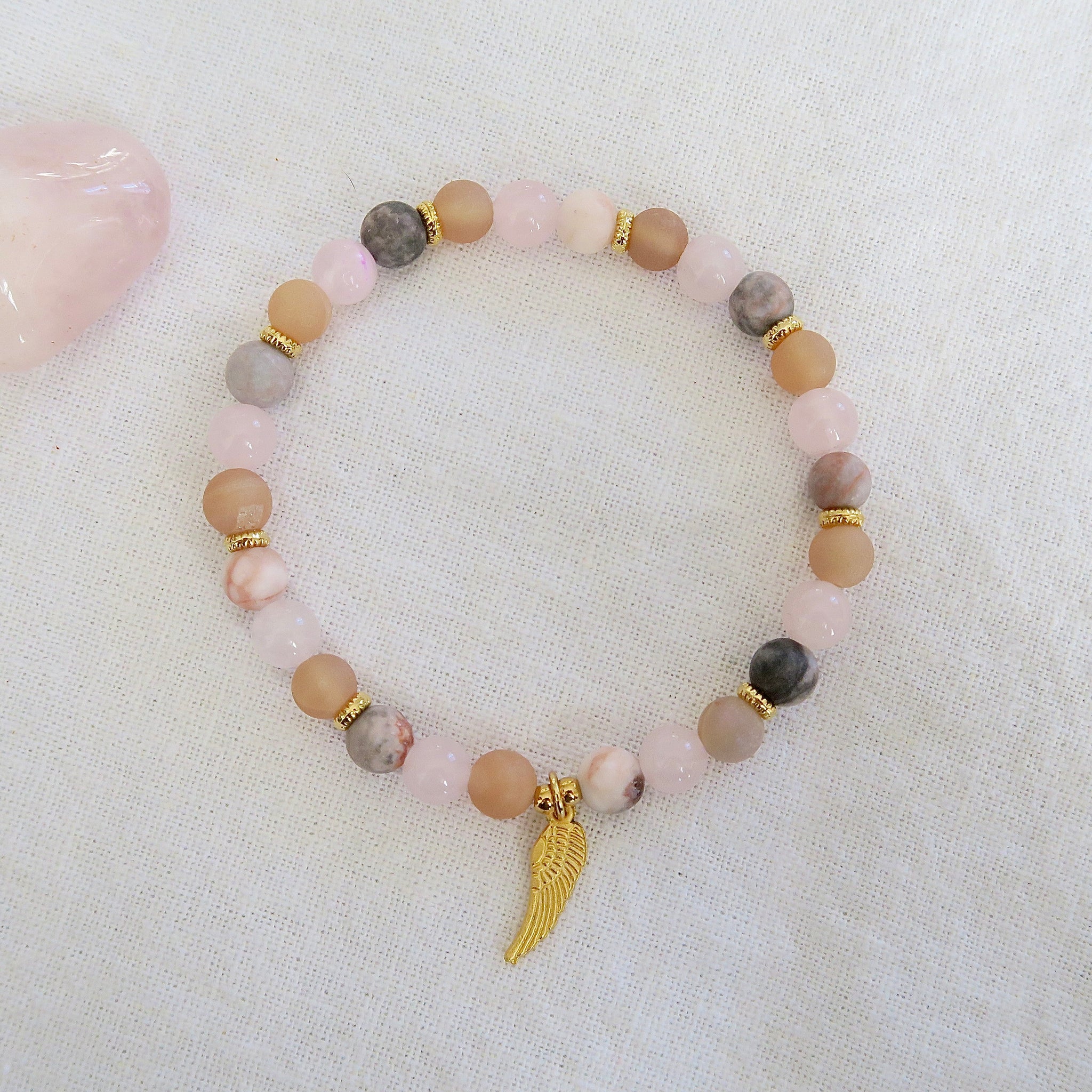 Le bracelet Éclat angélique est fait de pierres de Jaspe zèbre, de Quartz rose et d'Agate de 6mm. Il est agrémenté d'un pendentif d'aile d'ange plaqué or.