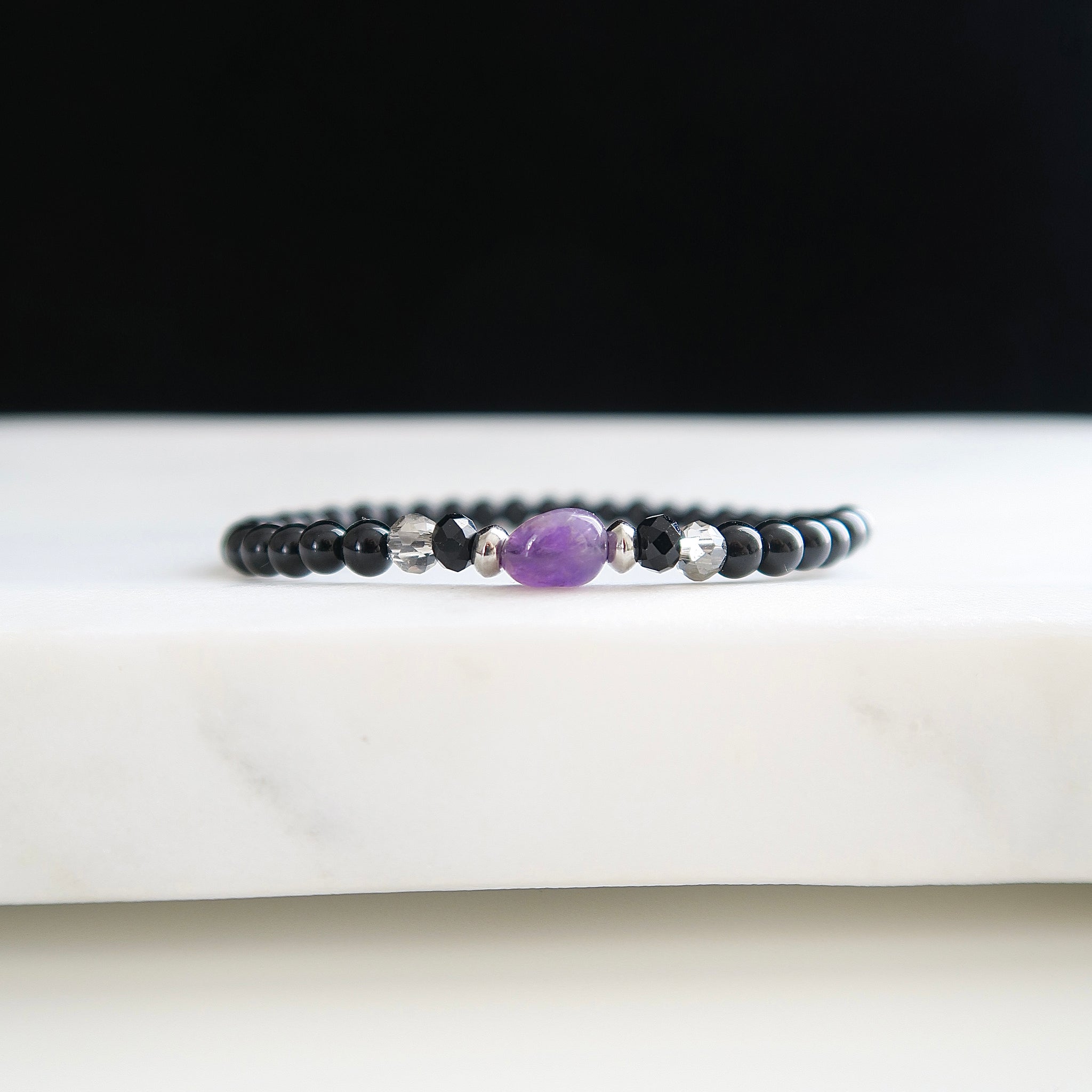 Le bracelet Esprit ancré est confectionné avec des pierres d'Onyx de 4mm. Il est agrémenté d'une délicate pierre d'Améthyste.