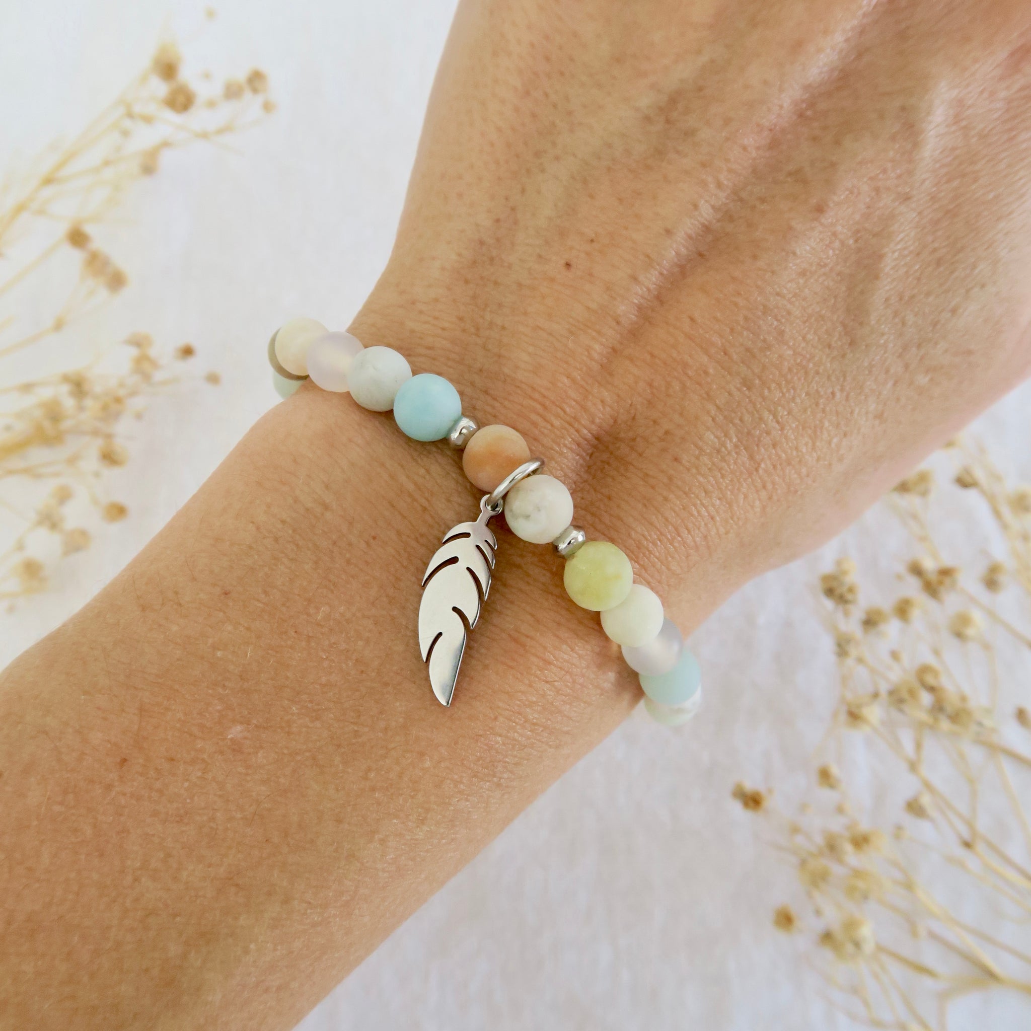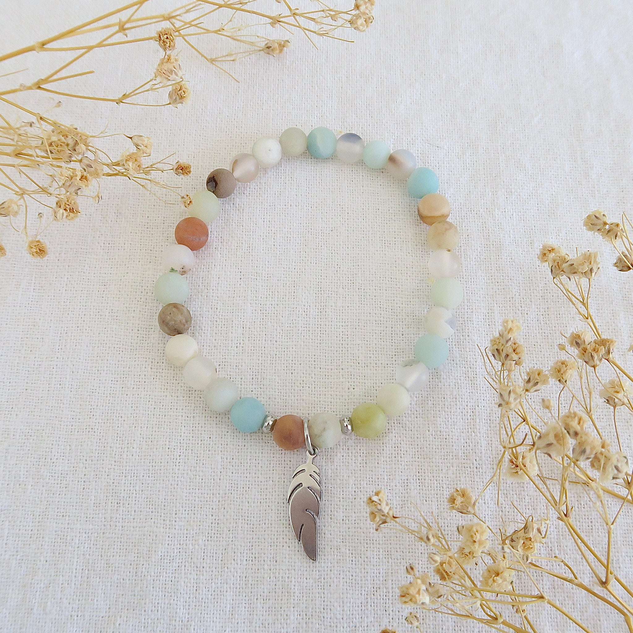 Le bracelet Esprit nomade est fabriqué avec des pierres d'Amazonite de 6mm. Il est agrémenté d'un pendentif plume en acier inoxydable.