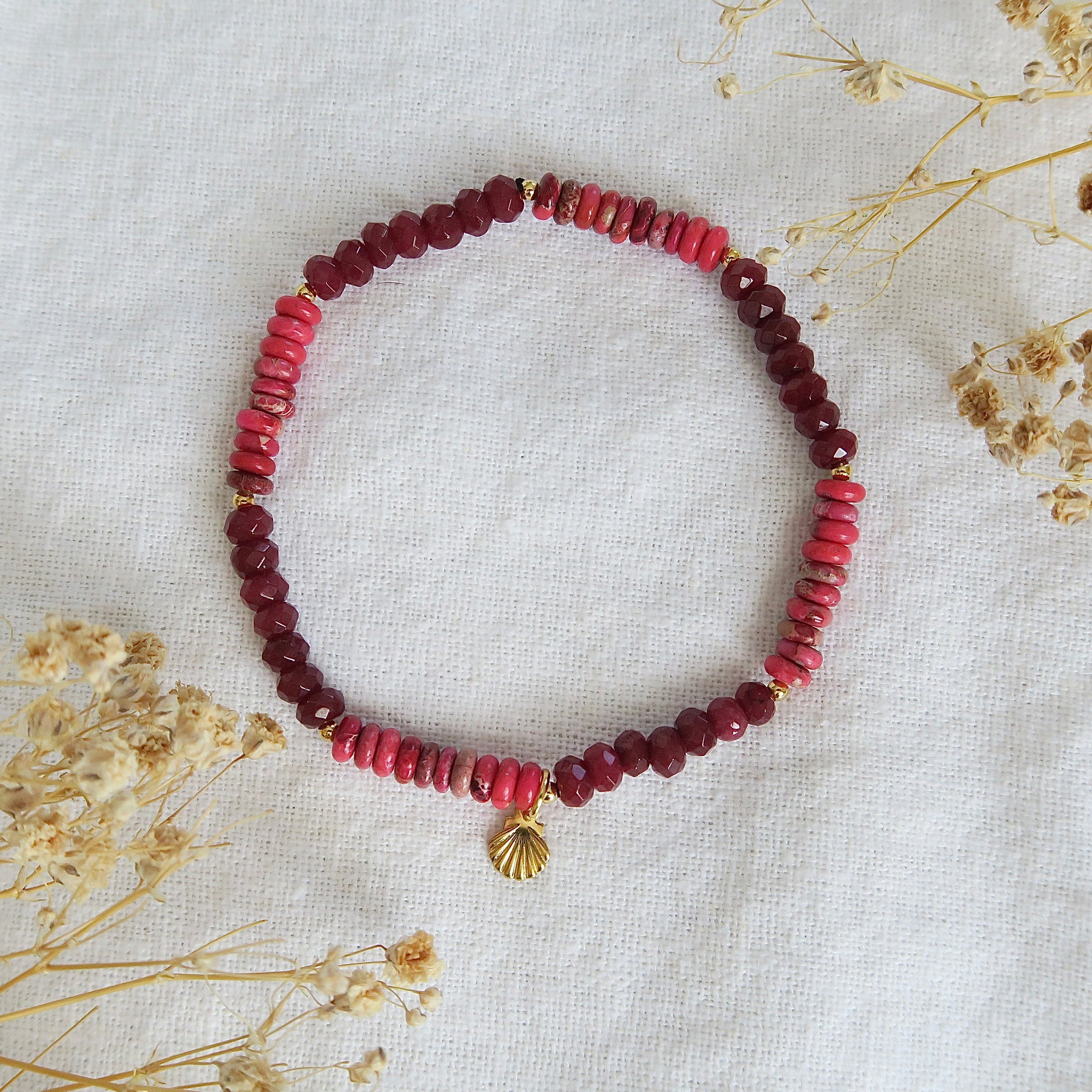 Le bracelet Hibiscus sacré est fait de pierres de Jade rouge et de Jaspe impérial de 4mm. Il est agrémenté d'un petit pendentif coquillage doré.