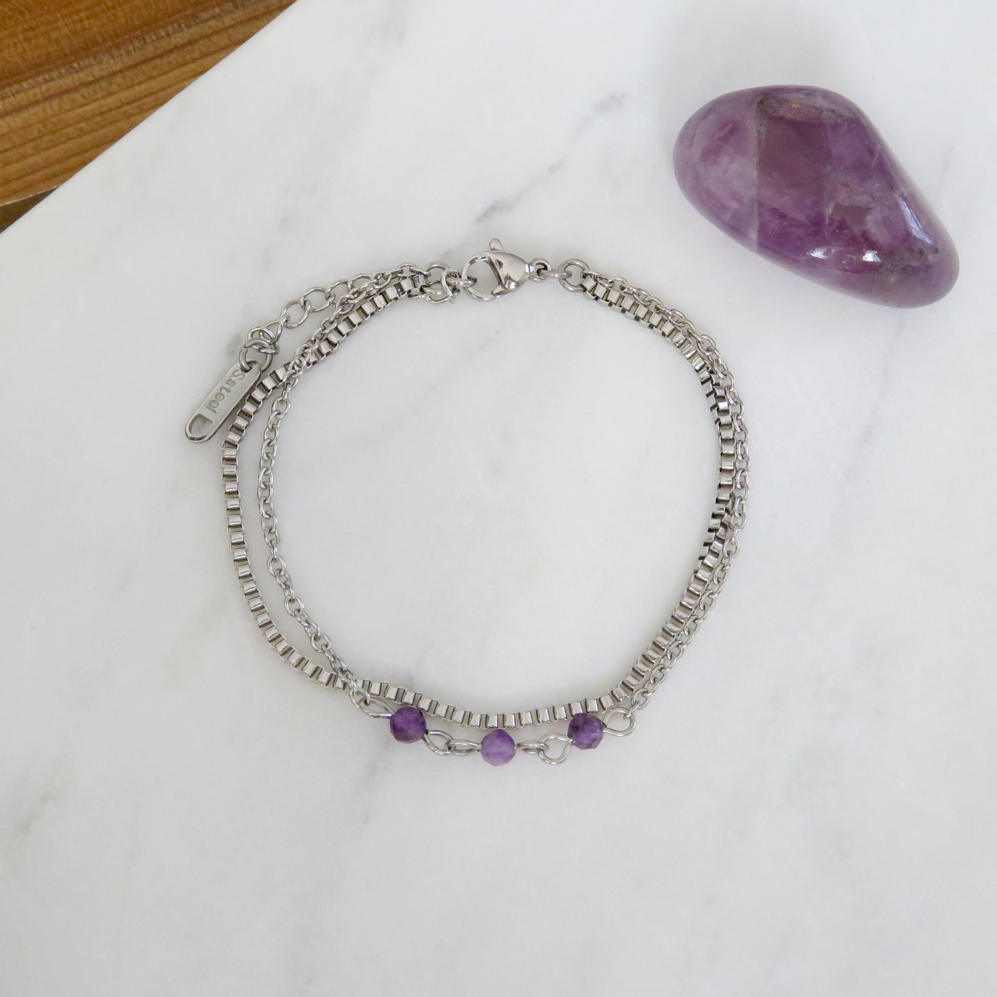 Bracelet avec chaine double en acier inoxydable. Il est agrémenté de délicates pierres d'Améthyste de 4mm.