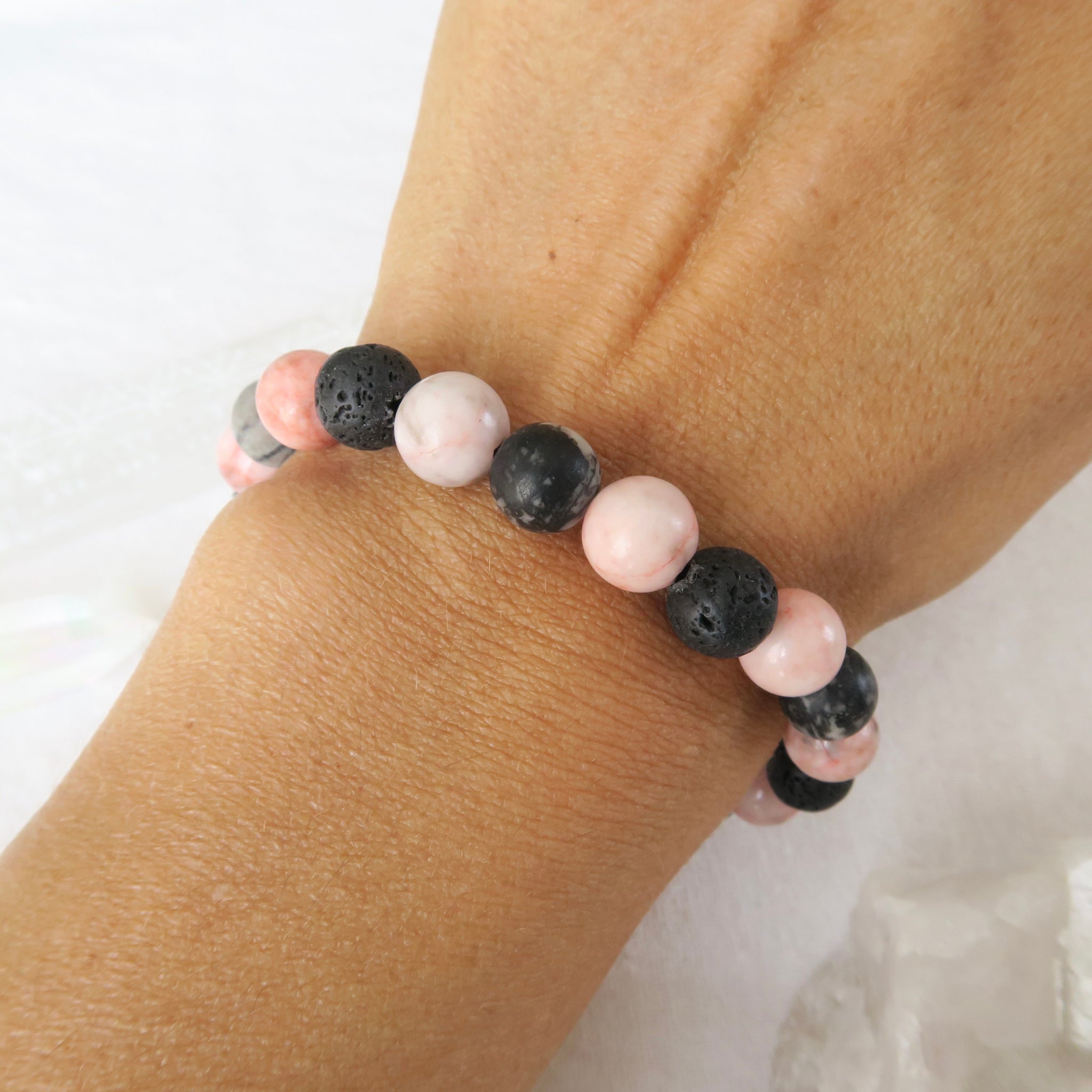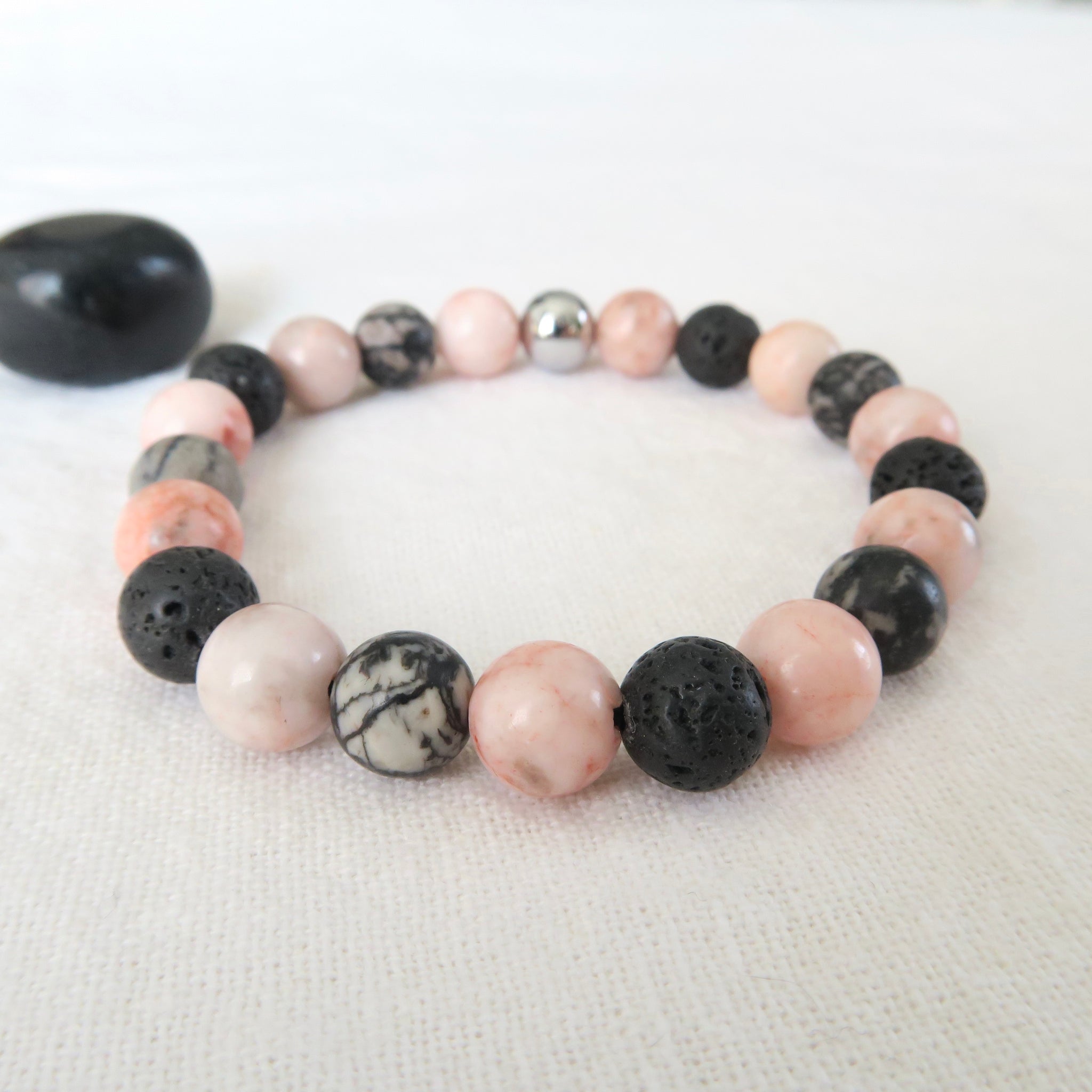 Le bracelet Mystère de la Terre est fait de pierres de Jaspe zèbre, de Jaspe gris et de pierres volcaniques de 8mm.