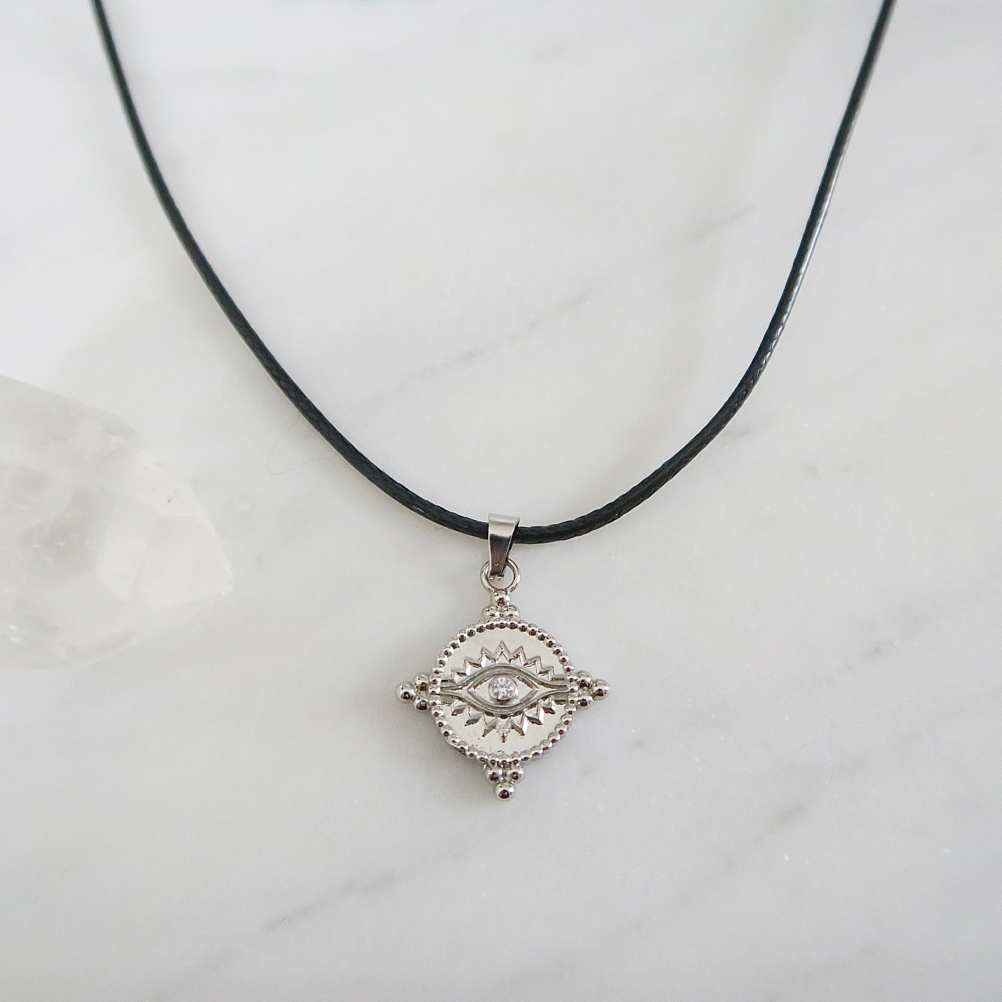 Collier avec corde en similicuir et pendentif plaqué rhodium.